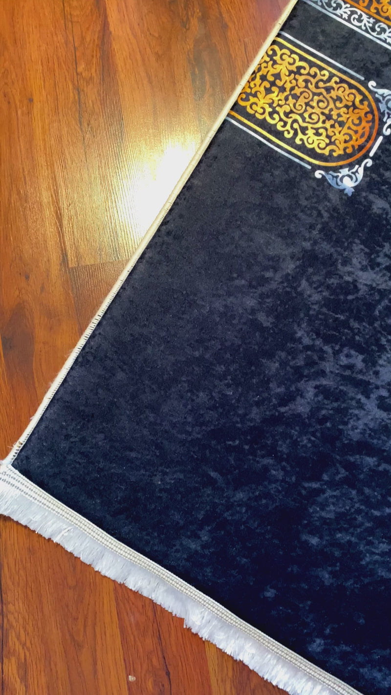 Kabe motifli siyah kadife zemin üzerine altın detaylar işlenmiş bu özel seccade, 3 cm sünger dolgusu ile uzun süreli diz konforu sağlar.
