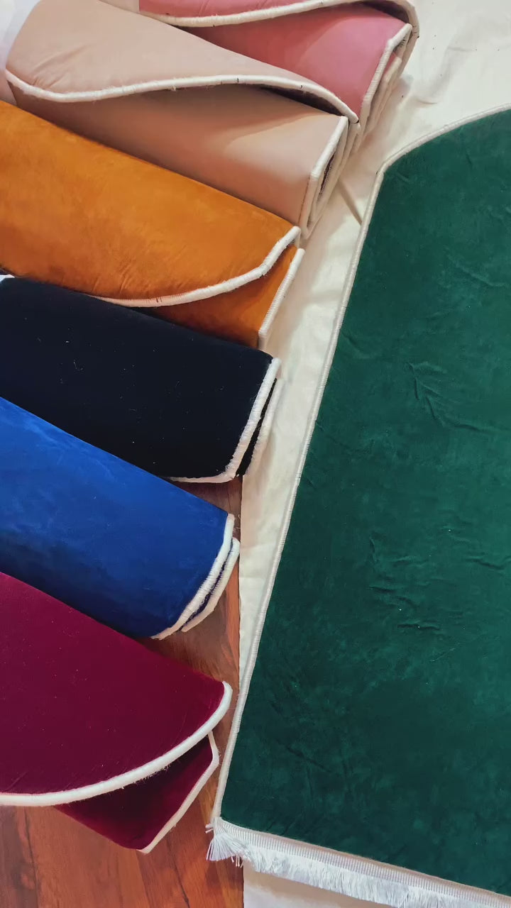 Minimal şıklığı sevenler için sade ama zarif bir tercih. Düz renkli kadife seccademiz, ortopedik süngeri sayesinde dizlerinizi korur.