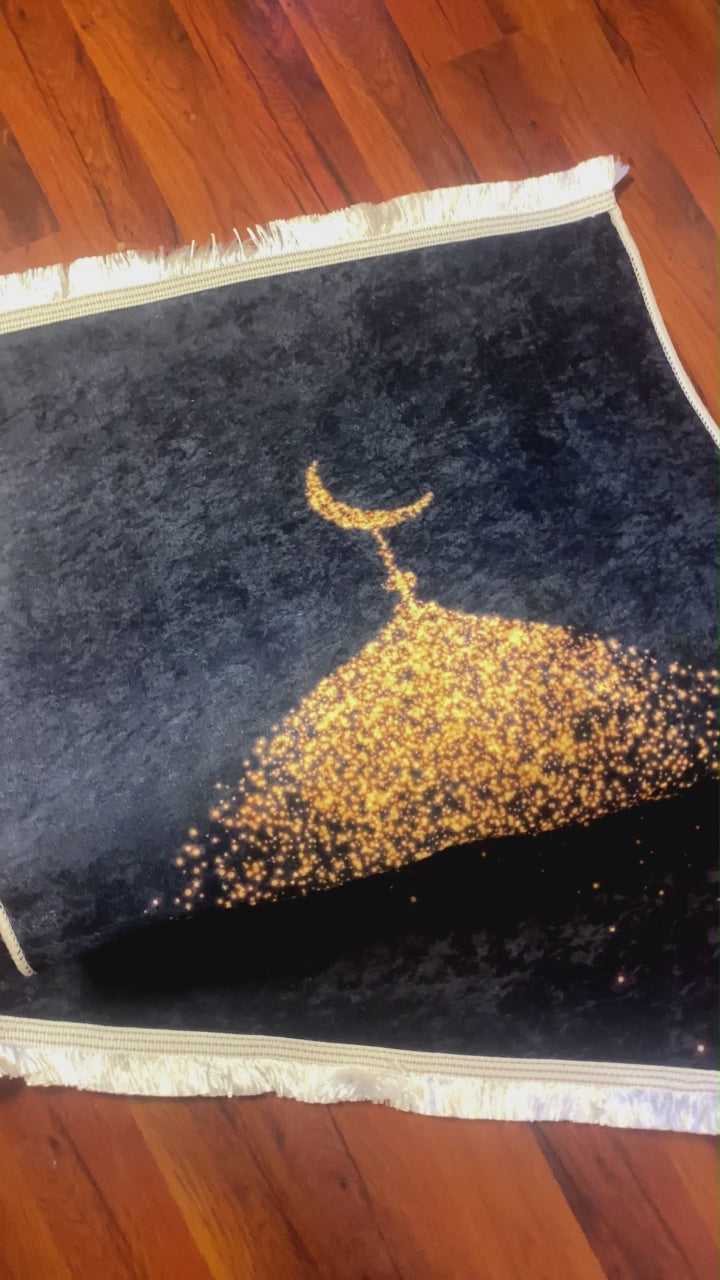Sade gold tasarımıyla öne çıkan bu seccade, keten astar ve kadife yüzeyiyle konfor sunar. Kişiselleştirme özelliğiyle anlamlı bir hediyedir.